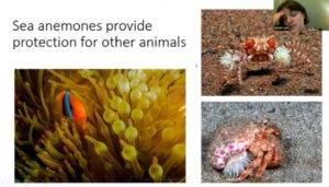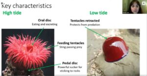 Beadlets (Actinia equina) have defensive weapons in the form of acrorhagi which house nematocysts, which are barbed ‘harpoons’ on threads. She showed sequences of attack and defence, with anemones suffering damage.